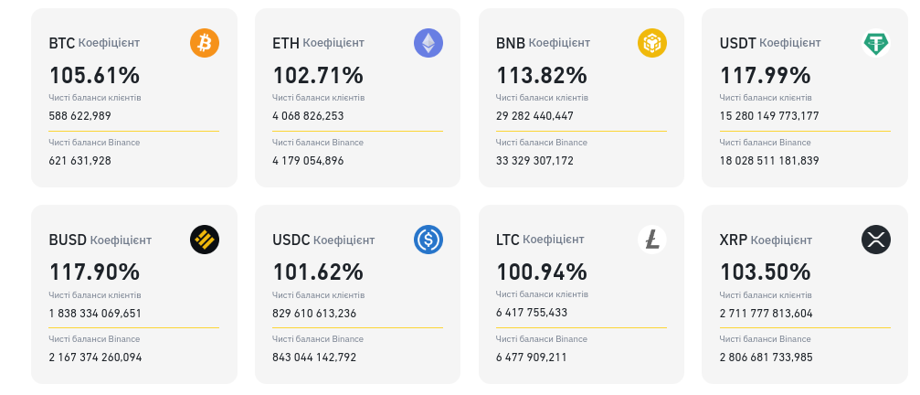 Коли ми говоримо про Proof of Reserves (підтвердження резервів), йдеться саме про активи користувачів, які ми зберігаємо. Це означає, що ми надаємо докази того, що в Binance є кошти, які покривають усі активи наших користувачів у співвідношенні 1:1, до того ж ми маємо додаткові резерви.