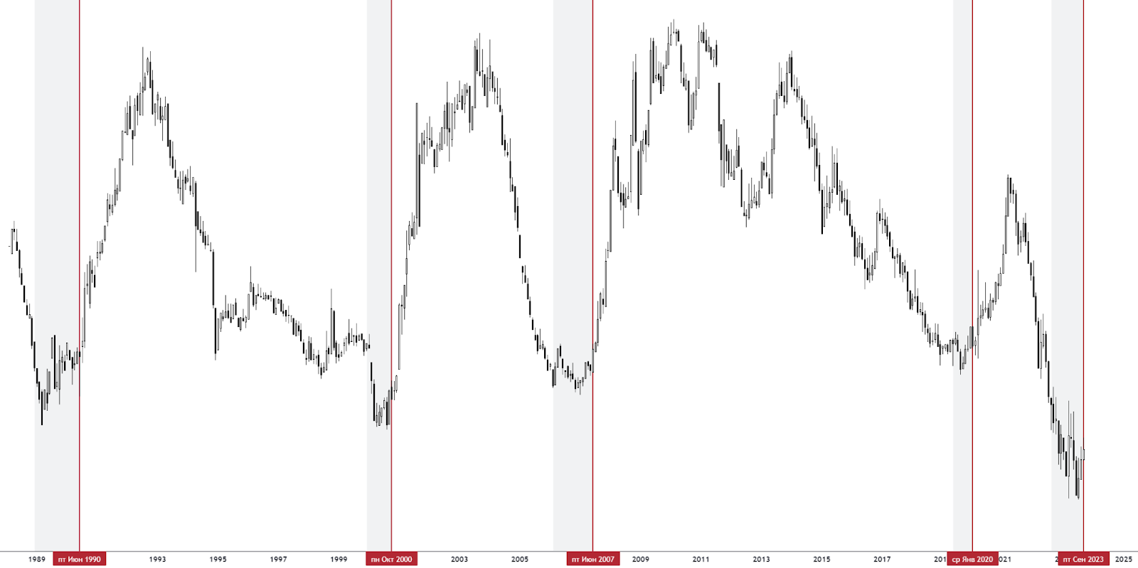 Перевернута крива прибутковості вказує на те, що інвестори очікують на економічне уповільнення або потенційну рецесію, тому спрямовують свої кошти у відносну безпеку довгострокових облігацій, що знижує їхню прибутковість, навіть якщо короткострокові ставки залишаються порівняно високими. Простими словами розумний капітал перетворюється на режим захисту капіталу (Risk OFF).