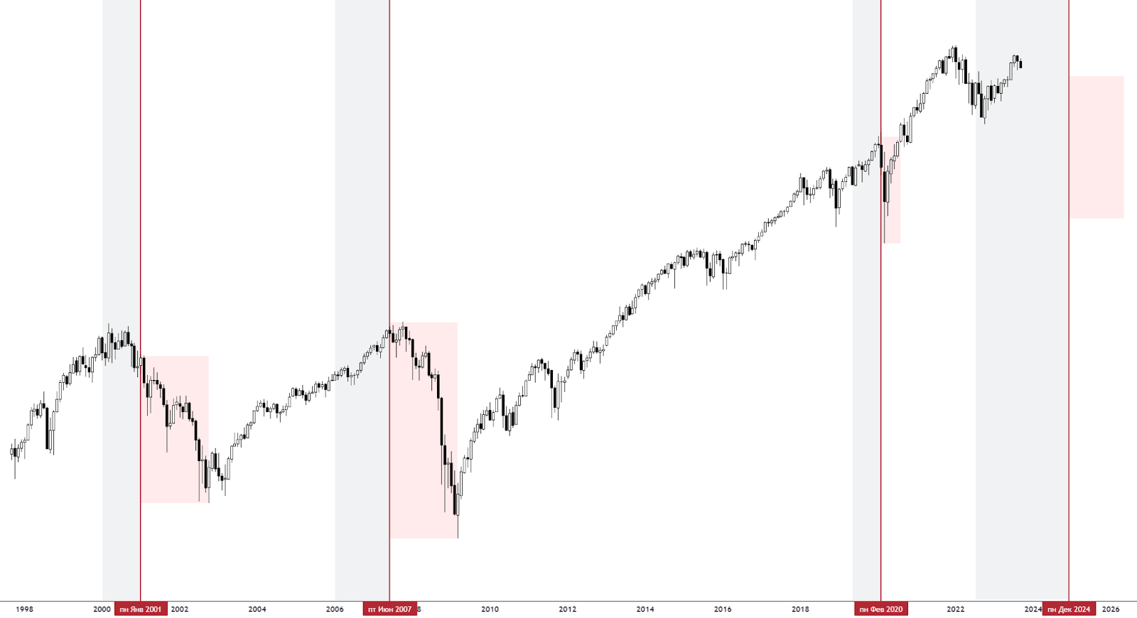 Разом з рецесією, як правило, відбувалося й падіння ринку акцій - у 2000 році лопнув пузир доткомів і ринок падав до 2003 року, втративши близько 50%, у 2008 році лопнув пузир іпотечних цінних паперів і S&P500 знову впав на 55%. І щоразу перед цим спостерігалася інверсія кривої прибутковості, яка дозволяла у потрібний момент вийти з ринку та уникнути втрат у портфелі.