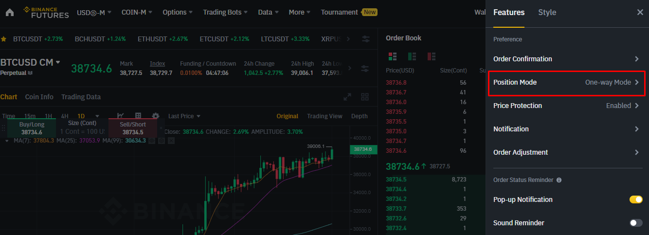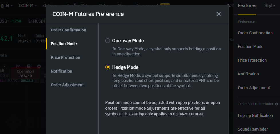 Щоб спростити використання стратегії, Binance Futures пропонує трейдерам спеціальний режим торгівлі, що дає змогу відкривати протилежні позиції в одному терміналі без необхідності використовувати різні ринки, торгові майданчики або акаунти.