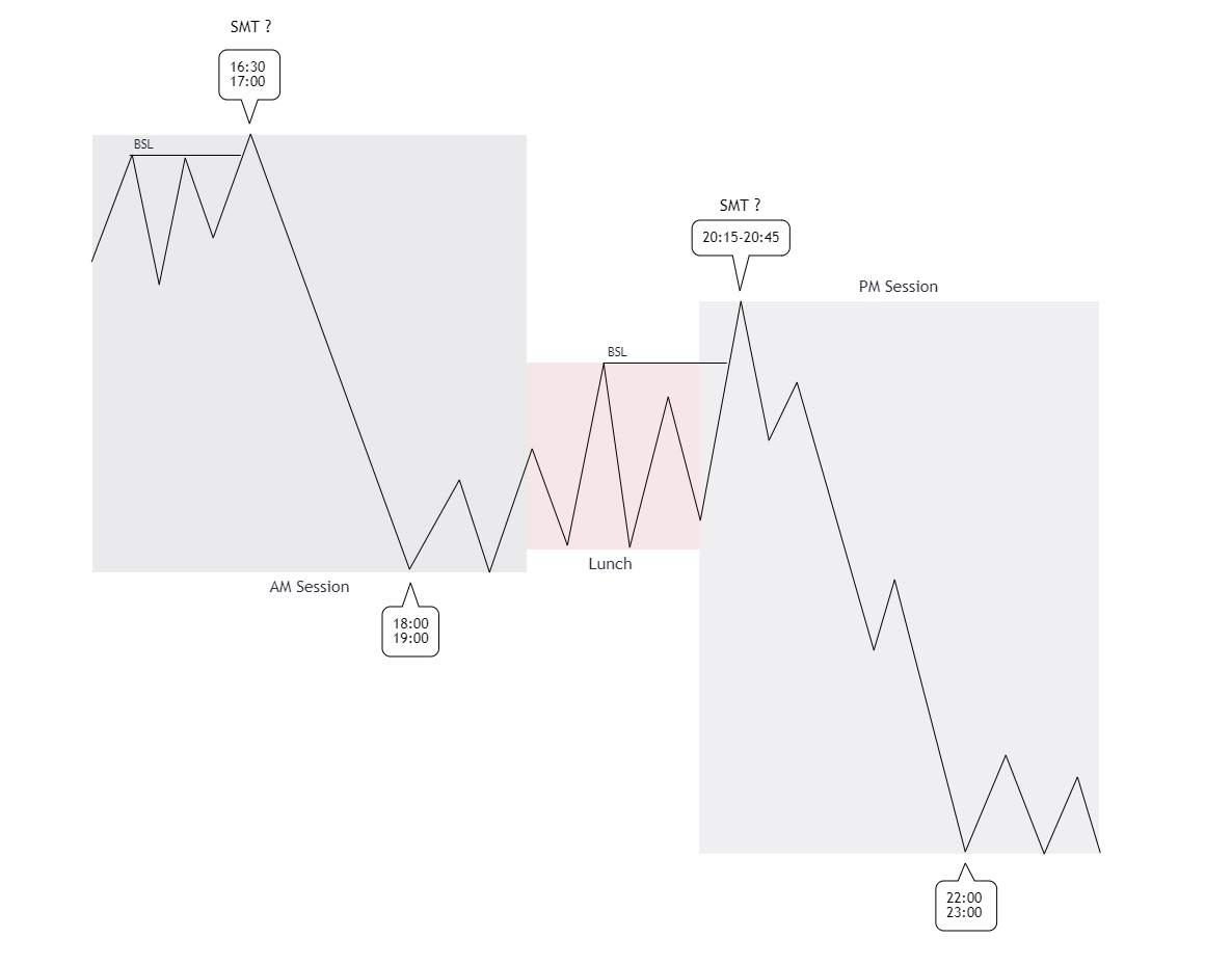 Зняття максимуму ланч-тайму або корекція в зону Premium АМ сесії, де потім відбувається імпульсний рух до самого закриття ринків. Слід спостерігати за кореляцією та SMT на відкритті PM.